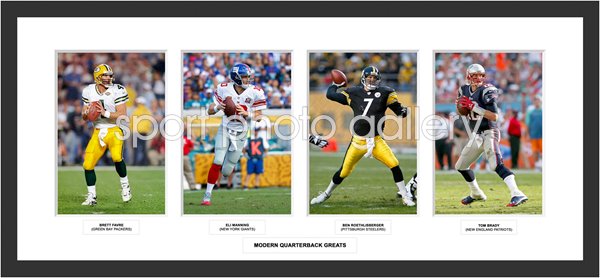 Modern Quarterback Greats Special – a 4 photo selection featuring star quarterbacks in the modern era of NFL Football. Tom Brady (New England Patriots) – won his 4th Superbowl in 2015 to add to his previous wins in 2002, 2004 and 2005. Eli Manning (New York Giants) who led his team to the 2007 and 2011 Superbowl titles. Ben Roethlisberger (Pittsburgh Steelers) Superbowl winner in 2006 and 2009. Brett Favre (Green Bay Packers) Although he only won the Superbowl once in 1997 he visited the Pro Bowl 11 times and was NFL MVP 3 years in row from 1995 to 1997.