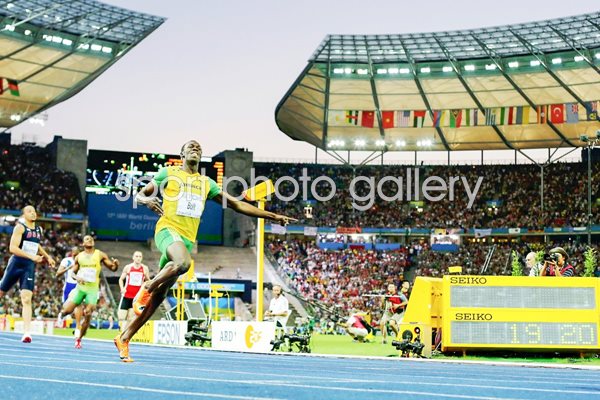 Usain Bolt of Jamaica crosses the line to win the gold medal in the men's 200 Metres Final during day six of the 12th IAAF World Athletics Championships at the Olympic Stadium on August 20, 2009 in Berlin, Germany. Bolt set a new World Record of 19.19 seconds. (Photo by Andy Lyons/Getty Images)