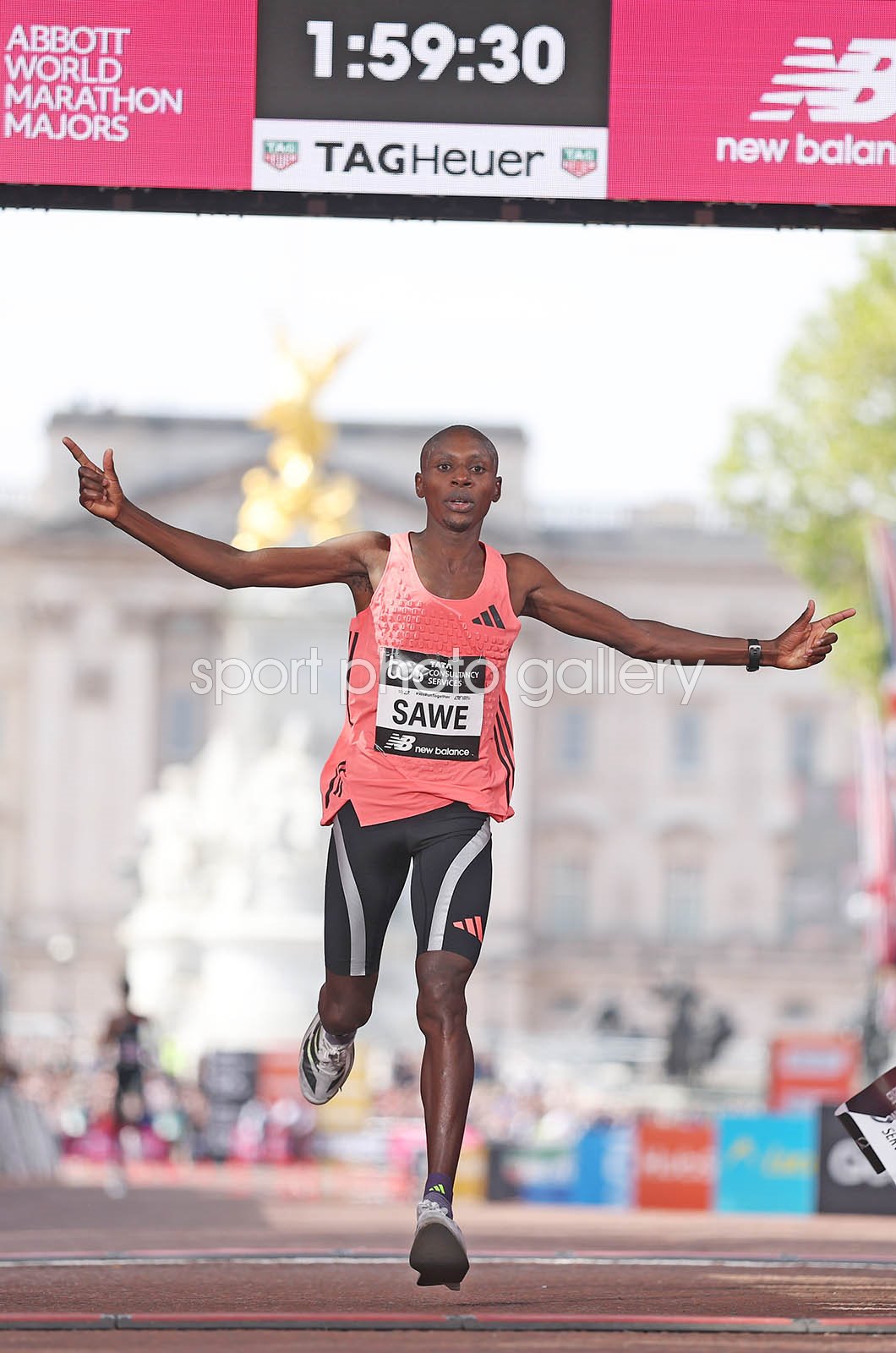 Sabastian Sawe of Team Kenya celebrates crossing the line and winning with a new World Record time during the Men’s 2026 TCS London Marathon on April 26, 2026 in London, England. (Photo by Alex Davidson/Getty Images) Code: 2273201734