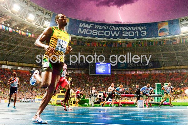 Already one of the truly great sporting images - A lightning bolt flashes in the night sky above the Luzhniki Stadium in Moscow as the undisputed king of Athletics and sprint legend Usain Bolt of Jamaica wins the 100 metres final at the 2013 IAAF World Championships. Bolt timed a season's best 9.77 seconds, with American Justin Gatlin claiming silver in 9.85sec and Nesta Carter, also of Jamaica, taking bronze in 9.95sec.