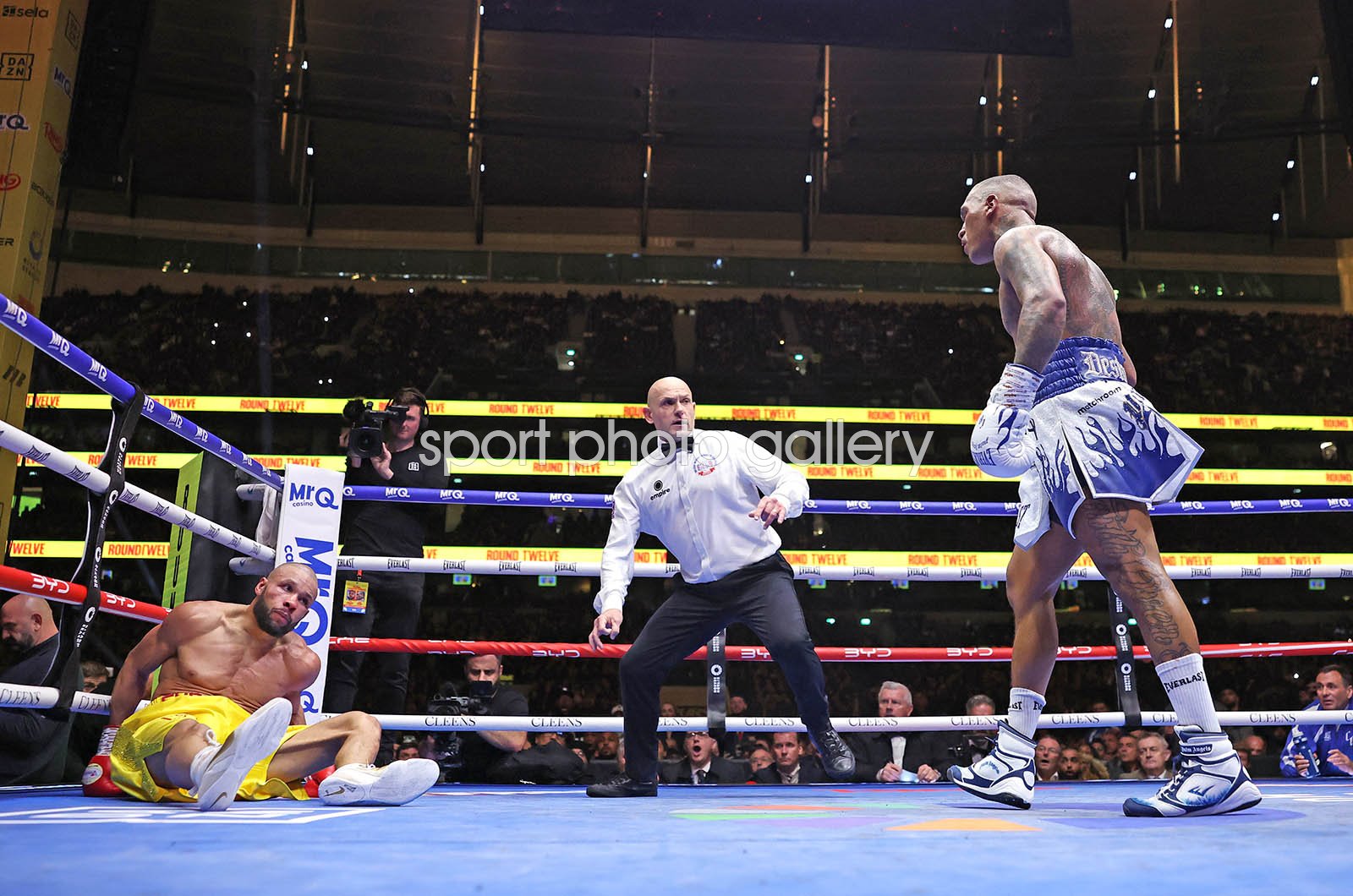Chris Eubank Jr is knocked down by Conor Benn during their middleweight fight on the ‘Unfinished Business’ fight card at Tottenham Hotspur Stadium on November 15, 2025 in London, England. (Photo by Justin Setterfield/Getty Images)