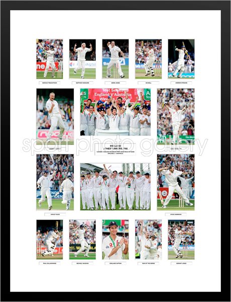 A selection of images celebrating England's historic Ashes series win in 2005. The montage contains a photo of all 12 players who took part in the series together with 2 memorable images of England's celebrations following the dramatic final day at the Oval. *** The photo only option comes as a single 28" x 20" print with all the player names and caption information in place***