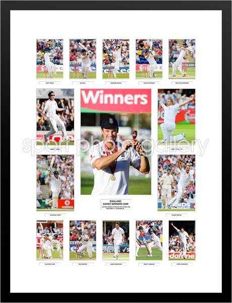 A selection of images celebrating England's memorable series win in the 2009 Ashes. The montage contains a photo of the 14 players who took part in the series. *** The photo only option comes as a single 28" x 20" print with all the player names and caption information in place***