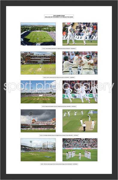 The montage features a scene from each of the 5 2015 Ashes test grounds together with a memorable moment from each game. The montage is available as a single 32” x 20” photographic print with all the caption information in place, in a frame ready mount at 34” x 22” and fully framed at 36” x 24”