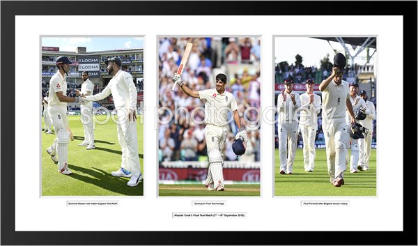 A stunning triple photo collage to celebrate Alastair Cook's fairytale farewell to test cricket. Alastair Cook announced his retirement shortly before England's final test of the series against India at the Oval. He was given a guard of honour by the Indian team culminating in a warm handshake from captain Virat Kohli as he walked out to bat on day 1 - after getting dismissed for 71 in the first innings, the match afforded one last opportunity to sign off in style in the 2nd innings. Anticipation and tension grew as he neared his century which in the end arrived in comedic fashion with 4 overthrows - the ovation he received as he reached his hundred lasted for several minutes - a testament to the popularity of the player and the man - a record breaking run machine and a true gentleman.