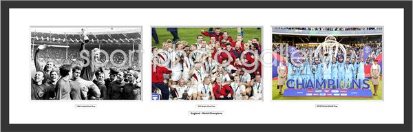 A ultimate celebration collage to commemorate England's unique achievement of becoming the only nation to have won the Football World Cup (1966), The Rugby World Cup (2003) and The Cricket World Cup (2019). England sports fans not old enough to have seen the 1966 Football World Cup Final will have seen TV footage of the euphoric scenes at Wembley Stadium as the legendary Bobby Moore paraded the Jules Rimet trophy on the shoulders of his team-mates after a dramatic extra time win over West Germany. The magnitude of this achievement, arguably the biggest team prize in sport, is appreciated every 4 years as England try to win it again, so far unsuccessfully. The Rugby World Cup Final in 2003 was even more dramatic taking a last-minute drop goal from Jonny Wilkinson in the dying seconds of extra time for England to beat Australia in Sydney. And so the the 2019 Cricket World Cup - surely this couldn't match the drama and excitement of England's previous World Cup triumphs ..