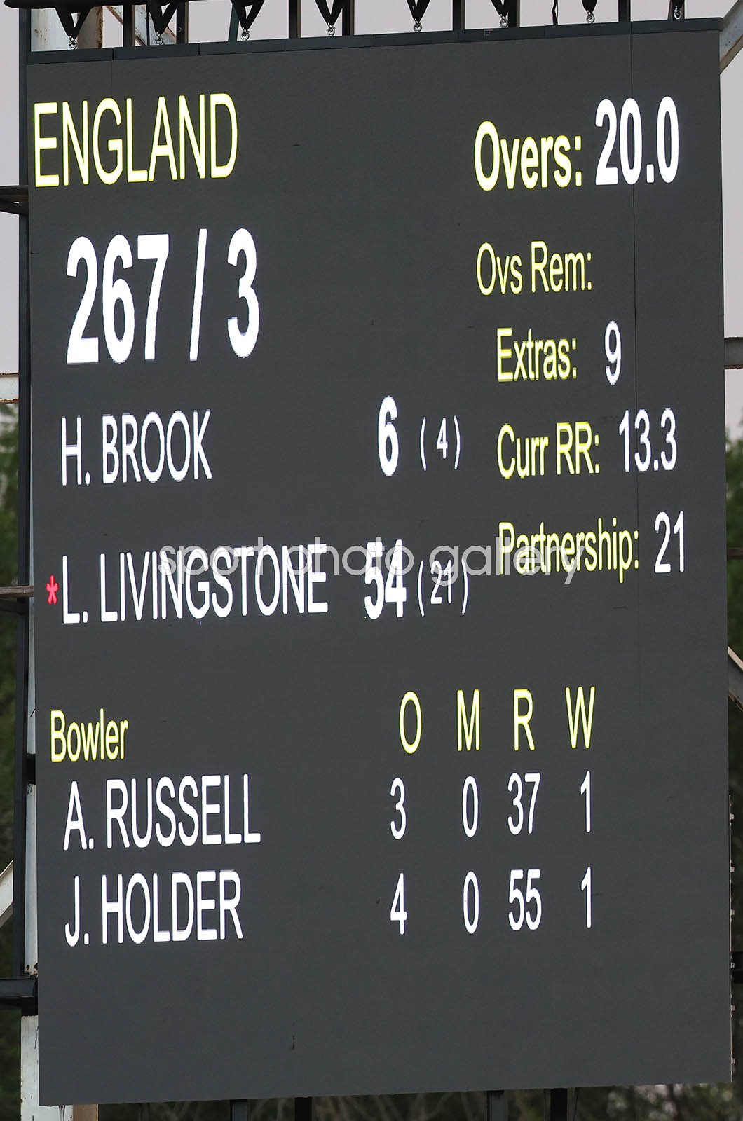 A general view of the scoreboard after England's innings of 267 during the 4th T20 International match between West Indies and England at Brian Lara Cricket Academy on December 19, 2023 in Tarouba, Trinidad and Tobago. (Photo by Ashley Allen/Getty Images)