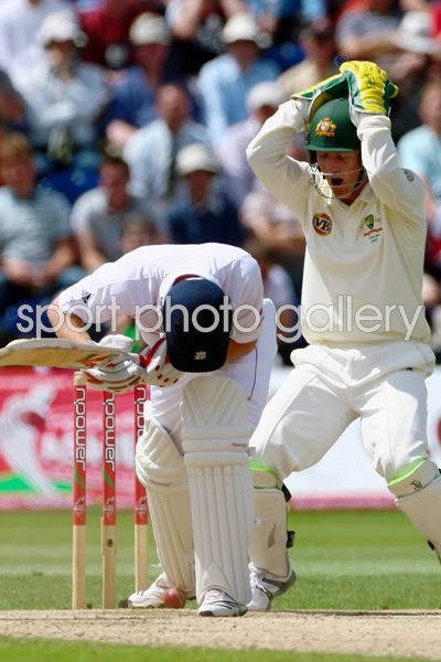 Brad Haddin of Australia holds his head after Paul Collingwood of England stops the ball from hitting his wicket during day five of the npower 1st Ashes Test Match between England and Australia at the SWALEC Stadium on July 12, 2009 in Cardiff, Wales.  (Photo by Clive Rose/Getty Images)