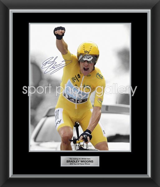 After becoming the first British cyclist in history to win the Tour de France, Bradley Wiggins followed that accomplishment up with a dominating performance in the Individual Men’s Time Trial at the London 2012 Games, making him the only person ever to have won both events in the same year. With a total of seven Olympic medals, four of which are gold, he is the most decorated British Olympian of all-time along with Chris Hoy. Even more amazing, he is the only person to have won a Grand Tour and a gold medal in Olympic track cycling, making him arguably the most complete cyclist in history. This beautiful limited edition memorabilia piece is personally signed by Bradley and commemorates his historical win at the 2012 Tour de France. Strictly limited to only 200 units, each piece is beautifully presented within a double mounted, premium black and silver frame, certain to preserve a lifetime of cherished memories from one of Great Britain's proudest sporting moments. All products are uniquely hologram'd (with an INNOVATIVE SPORTS branded hologram) and supplied with a 'postcard' Cerificate of Authenticity. Finished frame size approx. 28 x 20 in. (71 x 51 cm)".