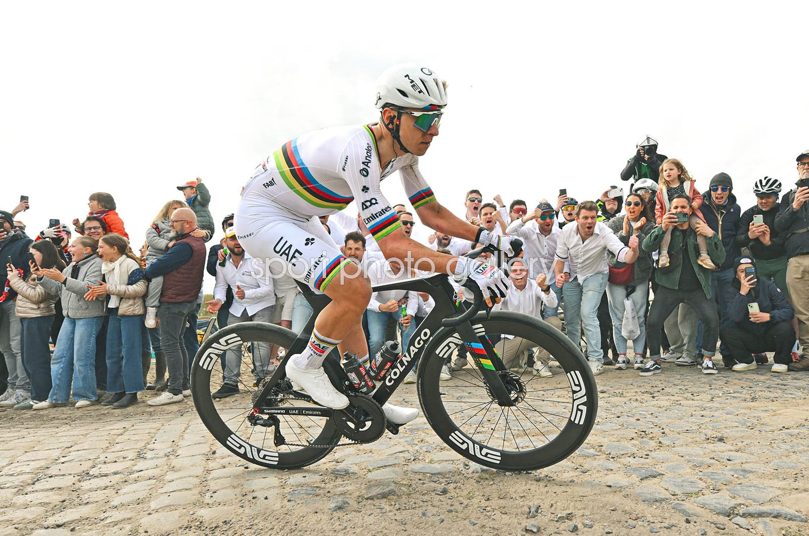 Tadej Pogacar of Slovenia and UAE Team Emirates - XRG competes in the breakaway passing through the Carrefour de l'Arbre cobblestones sector while fans cheer during the 123rd Paris-Roubaix Hauts-de-France 2026 - Men's Elite a 258.3km one day race from Compiegne to Roubaix / #UCIWT / on April 12, 2026 in Roubaix, France. (Photo by Dario Belingheri/Getty Images)