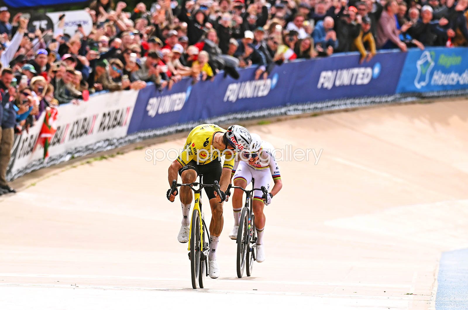 Race winner Wout van Aert of Belgium and Team Visma | Lease a Bike and Tadej Pogacar of Slovenia and UAE Team Emirates - XRG sprint at finish line in the Roubaix Velodrome - Andre Petrieux during the 123rd Paris-Roubaix Hauts-de-France 2026 - Men's Elite a 258.3km one day race from Compiegne to Roubaix / #UCIWT / on April 12, 2026 in Roubaix, France. (Photo by Dario Belingheri/Getty Images)