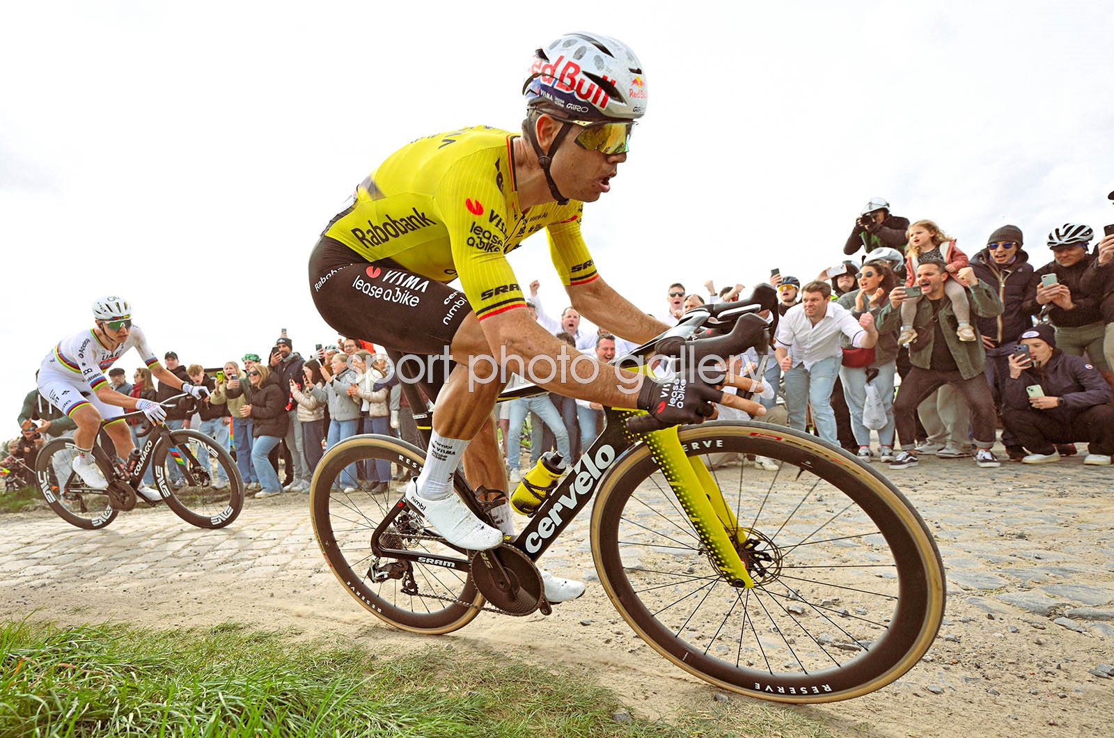 Wout van Aert of Belgium and Team Visma | Lease a Bike and Tadej Pogacar of Slovenia and UAE Team Emirates - XRG compete in the breakaway passing through the Carrefour de l'Arbre cobblestones sector while fans cheer during the 123rd Paris-Roubaix Hauts-de-France 2026 - Men's Elite a 258.3km one day race from Compiegne to Roubaix / #UCIWT / on April 12, 2026 in Roubaix, France. (Photo by Dario Belingheri/Getty Images)