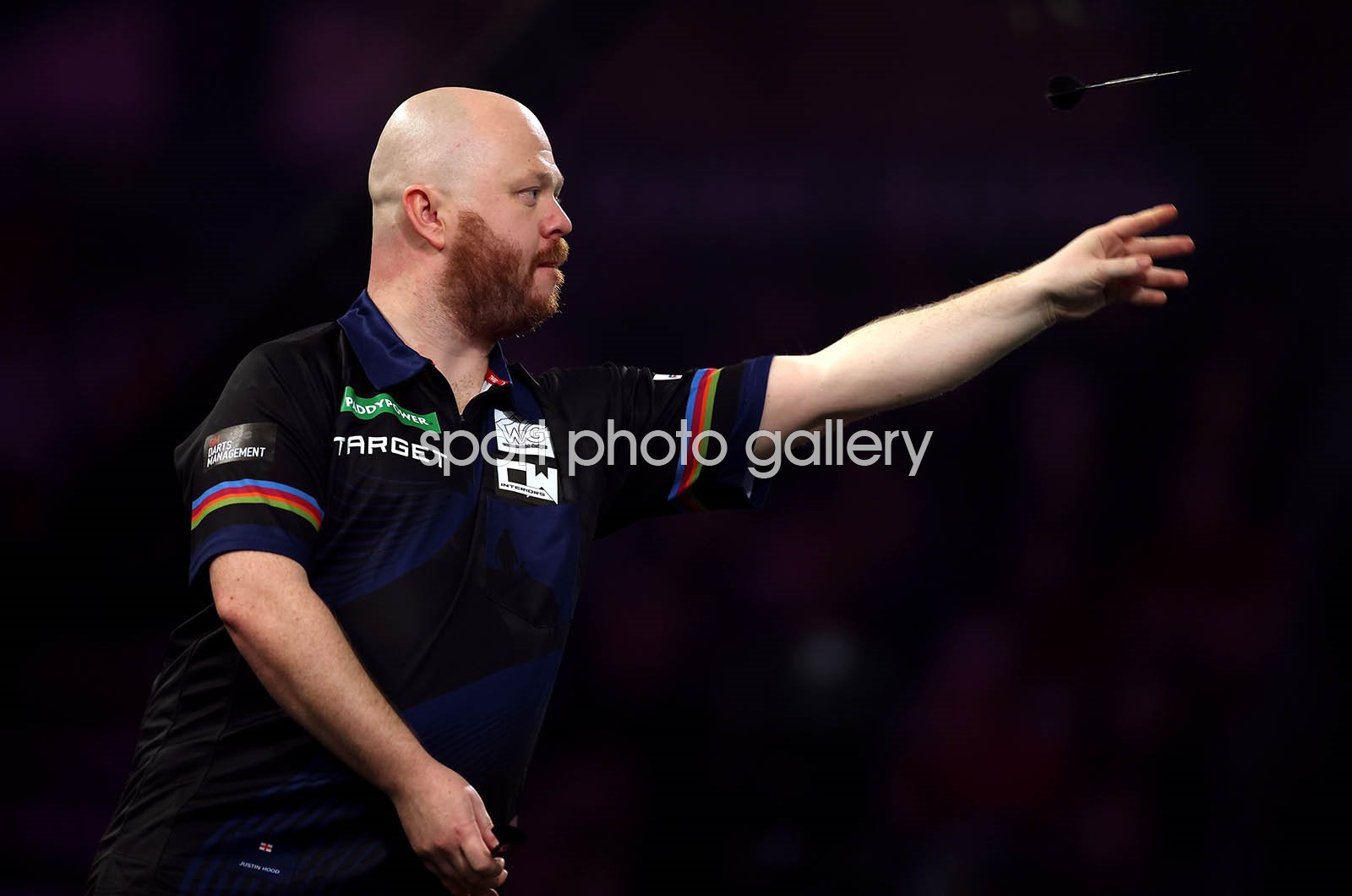 Justin Hood of England throws against Gary Anderson of Scotland (not pictured) during the Quarter-final match between Justin Hood and Gary Anderson on day eighteen of the 2025/26 Paddy Power World Darts Championship at Alexandra Palace on January 01, 2026 in London, England. (Photo by Warren Little/Getty Images)
