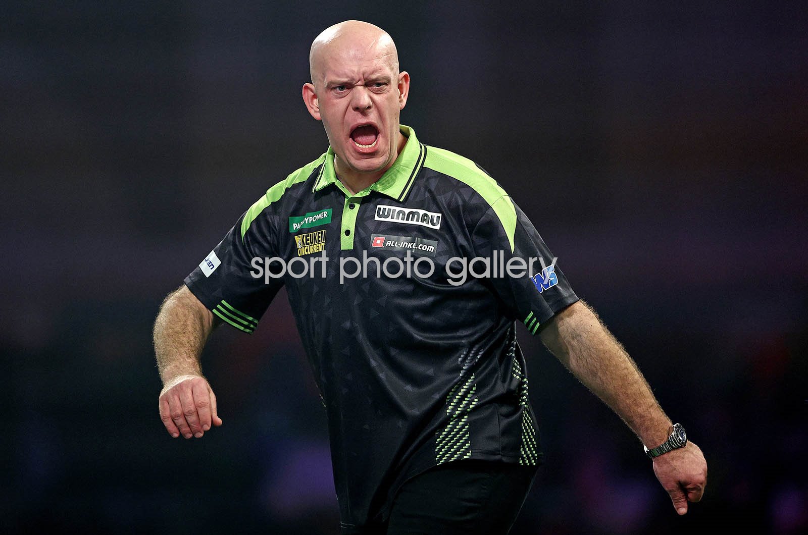 Michael van Gerwen of the Netherlands celebrates against Gary Anderson of Scotland (not pictured) during the Round Four match between Michael van Gerwen and Gary Anderson on day seventeen of the 2025/26 Paddy Power World Darts Championship at Alexandra Palace on December 30, 2025 in London, England. (Photo by James Fearn/Getty Images)
