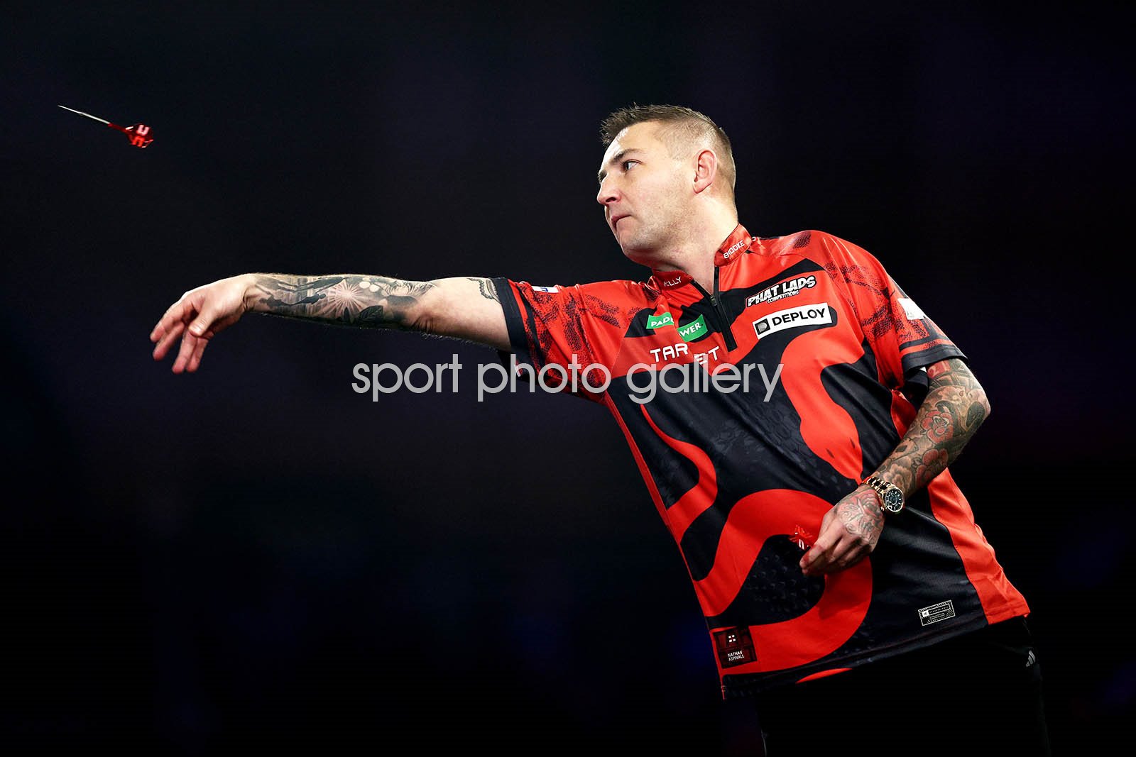 Nathan Aspinall of England throws against Kevin Doets of Netherlands during their third round match on day sixteen of the 2025/26 Paddy Power World Darts Championship at Alexandra Palace on December 29, 2025 in London, England. (Photo by James Fearn/Getty Images)