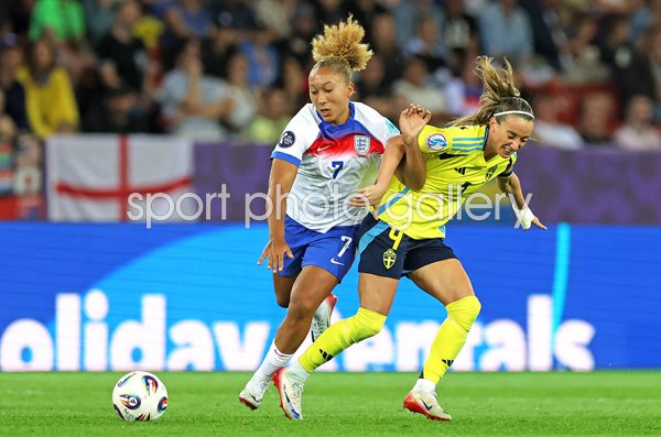 Lauren James of England runs with the ball whilst being challenged by Kosovare Asllani of Sweden during the UEFA Women's EURO 2025 Quarter-Final match between Sweden and England at Stadion Letzigrund on July 17, 2025 in Zurich, Switzerland. (Photo by Eddie Keogh/Getty Images)