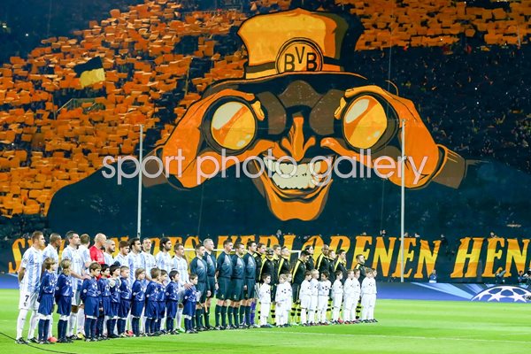The Malaga and Borussia Dortmund teams line up ahead of the UEFA Champions League quarter-final second leg match between Borussia Dortmund and Malaga at Signal Iduna Park on April 9, 2013 in Dortmund, Germany. (Photo by Alex Grimm/Bongarts/Getty Images) Code: 166173251