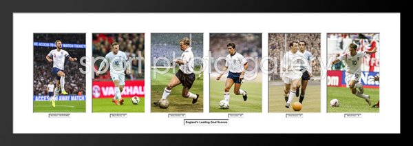NEW - England Leading Goal Scorers Special - we are delighted to offer this new collage in celebration of Harry Kane scoring his 54th International goal to become England's record goal scorer. His penalty during England's win in the opening Euro 2024 qualifier against Italy saw him top a list of England all-time greats who are all featured in the collage - Harry Kane - 54 (as of 23.03.23), Wayne Rooney - 53, Bobby Charlton - 49, Gary Lineker - 48, Jimmy Greaves - 44 & Michael Owen - 40.