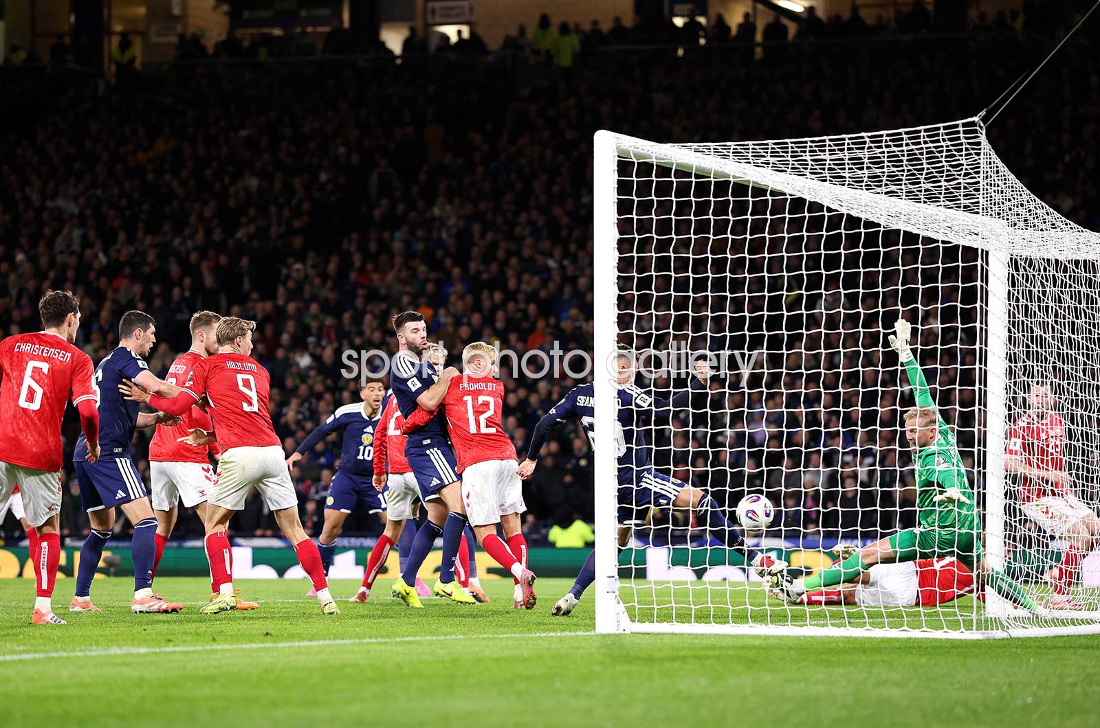 Lawrence Shankland of Scotland scores his team's second goal during the FIFA World Cup 2026 qualifier match between Scotland and Denmark at Hampden Park on November 18, 2025 in Glasgow, Scotland. (Photo by Stu Forster/Getty Images)