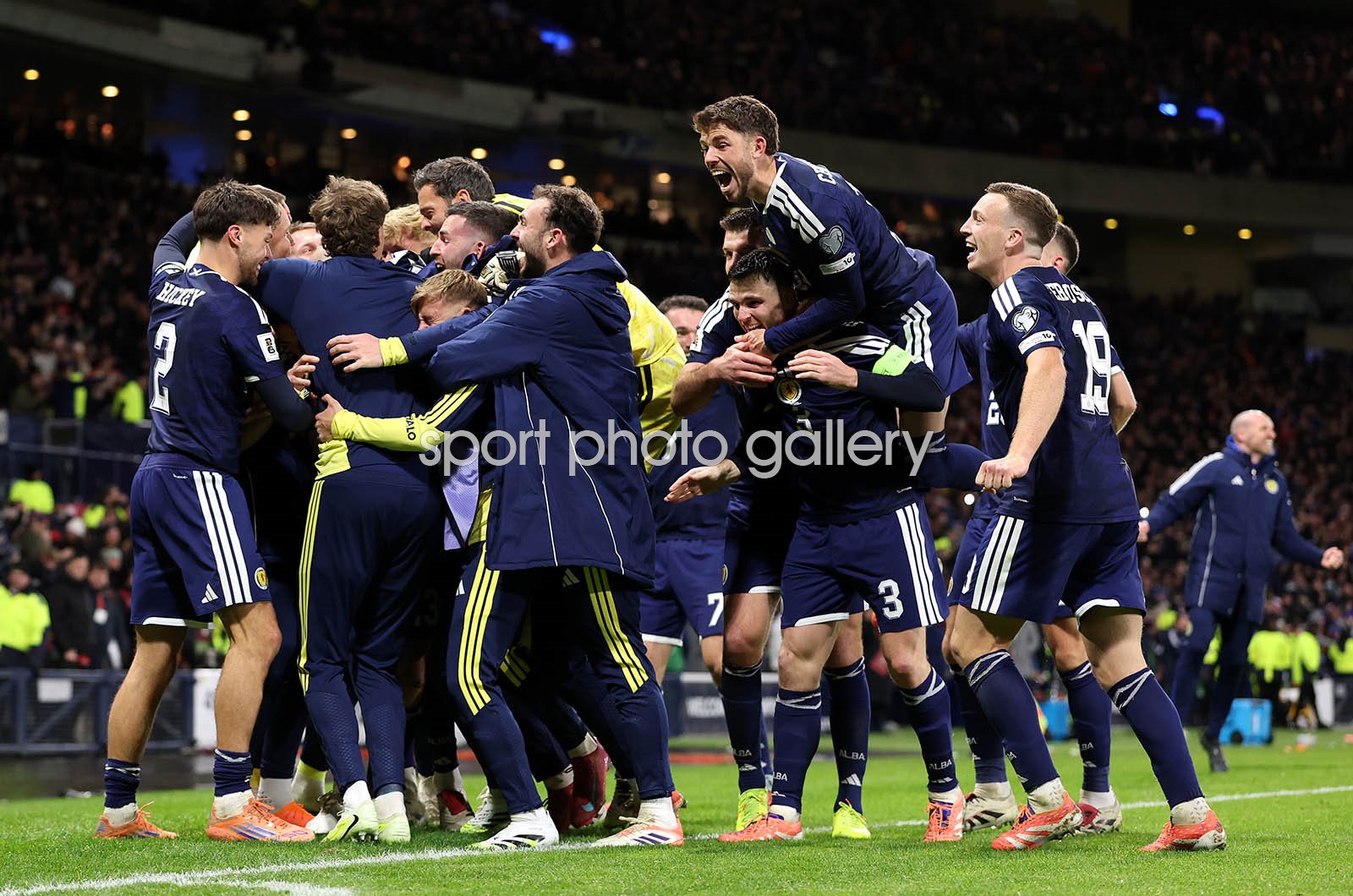 Kenny McLean of Scotland (obscured) celebrates scoring his team's fourth goal with teammates during the FIFA World Cup 2026 qualifier match between Scotland and Denmark at Hampden Park on November 18, 2025 in Glasgow, Scotland. (Photo by Stu Forster/Getty Images)