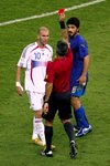 Zinedine Zidane (L) of France is shown the red card by Referee Horacio Elizondo of Argentina as Gennaro Gattuso of Italy looks on during the FIFA World Cup Germany 2006 Final match between Italy and France at the Olympic Stadium on July 9, 2006 in Berlin, Germany. (Photo by Mike Hewitt/Getty Images)
