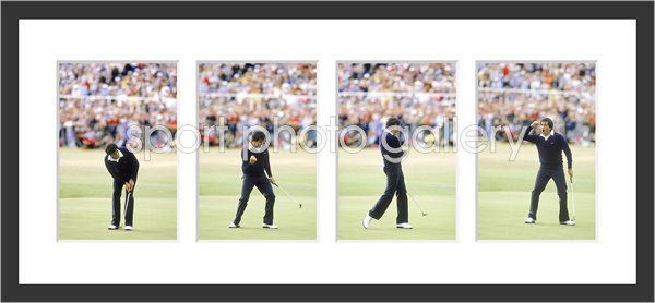 1984 ST ANDREWS - A truly stunning 4-stage collage capturing the drama and euphoria as Seve Ballesteros holed out for birdie on the 18th green to win the 1984 Open at St Andrews . The ultimate career moment of the legendary, hugely charismatic golfer Seve Ballesteros – a hero to a legion of golf fans around the world. His dramatic birdie putt on the final green to win the 1984 Open at St Andrews will live long in the memory of all those who witnessed it - the moment Seve Ballesteros himself described as “The happiest moment of my golfing career”. Our 4 stage putt sequence perfectly captures the moment – a stunning memento to remember a true sporting hero.