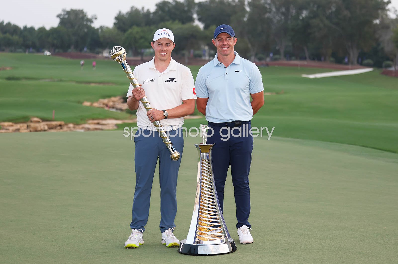 Matt Fitzpatrick of England and Rory McIlroy of Northern Ireland pose on the 18th green with the DP World Tour Championship and Race to Dubai trophies on day four of the DP World Tour Championship 2025 at Jumeirah Golf Estates on November 16, 2025 in Dubai, United Arab Emirates. (Photo by Andrew Redington/Getty Images)