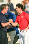 Rory McIlroy of Northern Ireland is congratulated by Luke Donald of England on the 18th green after winning the DP World Tour Championship on the Earth Course at Jumeirah Golf Estates on November 25, 2012 in Dubai, United Arab Emirates. (Photo by Andrew Redington/Getty Images)