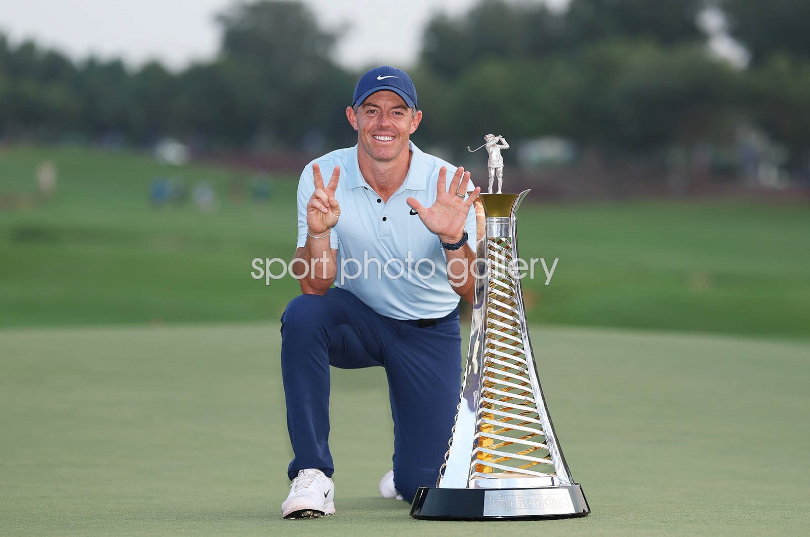Rory McIlroy of Northern Ireland poses, holding 7 fingers to the camera, alongside the Race to Dubai trophy on the 18th green on day four of the DP World Tour Championship 2025 at Jumeirah Golf Estates on November 16, 2025 in Dubai, United Arab Emirates. (Photo by Richard Heathcote/Getty Images)