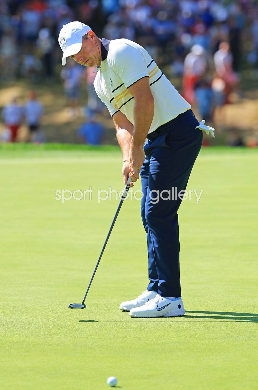 Rory McIlroy of Europe putts on the 3rd hole during the Sunday singles matches of the 2025 Ryder Cup at Black Course at Bethpage State Park Golf Course on September 28, 2025 in Farmingdale, New York. (Photo by David Cannon/Getty Images) Code: 2237606006