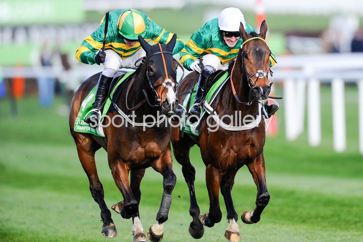 Jockey Barry Geraghty riding Jezki wins The Stan James Champion Hurdle from My Tent Or Yours and Tony McCoy (Right) at Cheltenham racecourse on March 11, 2014 in Cheltenham, England. (Photo by Alan Crowhurst/Getty Images) Code: 477834343