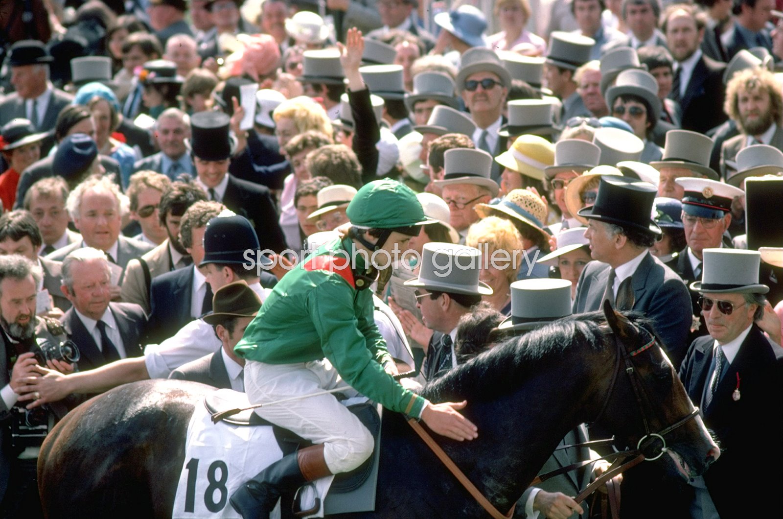 Jun 1981: Walter Swinburn of Great Britain on Shergar in the unsaddling enclosure after The Derby at Epsom racecourse in Epsom, England. \ Mandatory Credit: Adrian Murrell/Allsport Code: 1624487