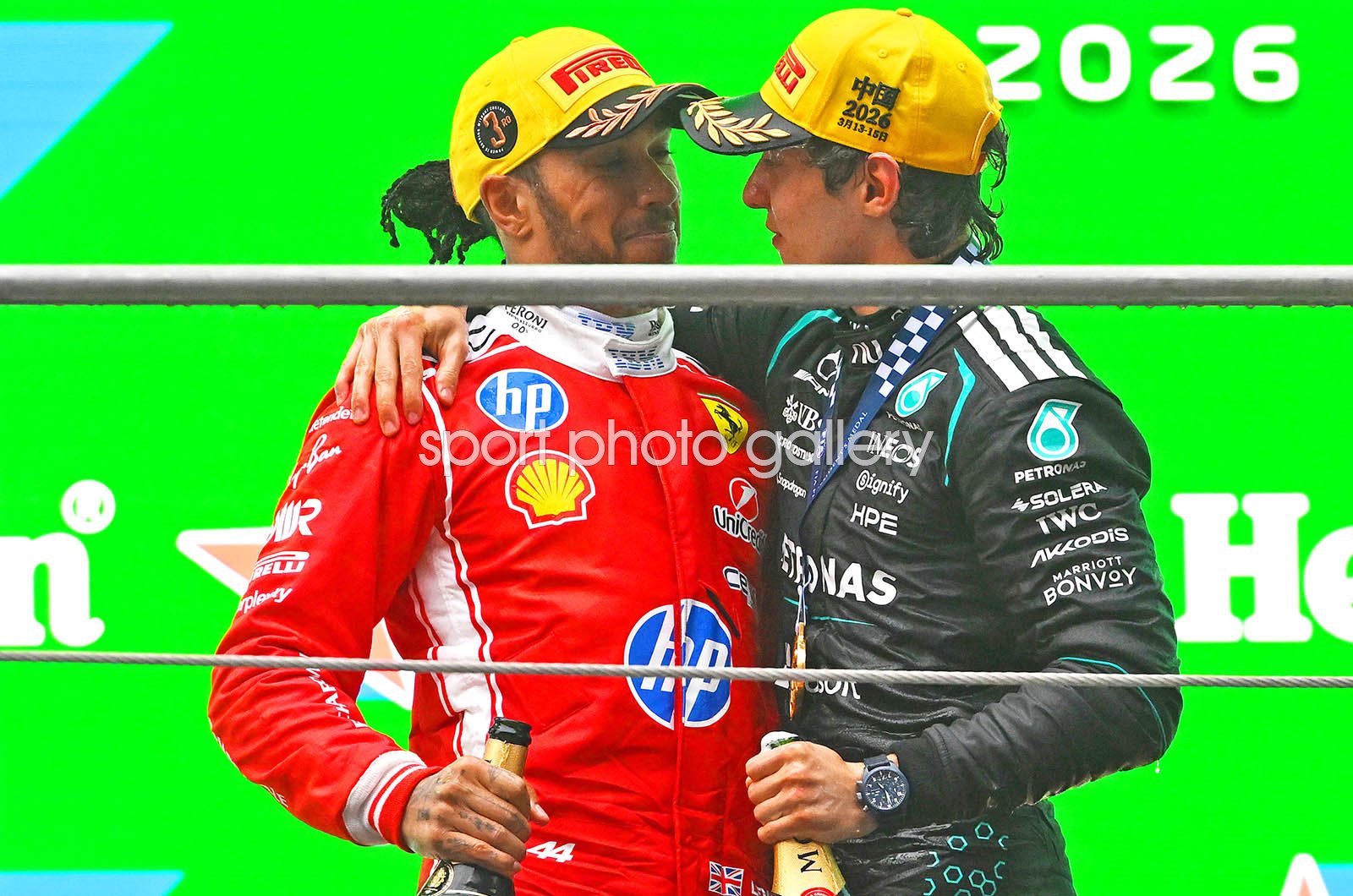 Race winner Andrea Kimi Antonelli of Italy and Mercedes AMG Petronas F1 Team and Third placed Lewis Hamilton of Great Britain and Scuderia Ferrari congratulate each other on the podium during the F1 Grand Prix of China at Shanghai International Circuit on March 15, 2026 in Shanghai, China. (Photo by Rudy Carezzevoli/Getty Images)