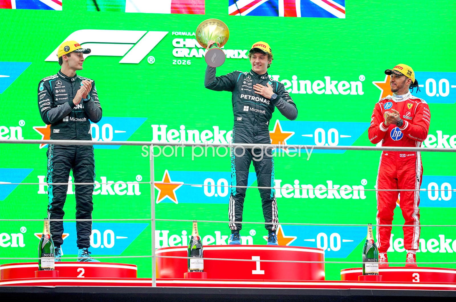 Race winner Andrea Kimi Antonelli of Italy and Mercedes AMG Petronas F1 Team Second placed George Russell of Great Britain and Mercedes AMG Petronas F1 Team and Third placed Lewis Hamilton of Great Britain and Scuderia Ferrari on the podium during the F1 Grand Prix of China at Shanghai International Circuit on March 15, 2026 in Shanghai, China. (Photo by Sona Maleterova/Getty Images)