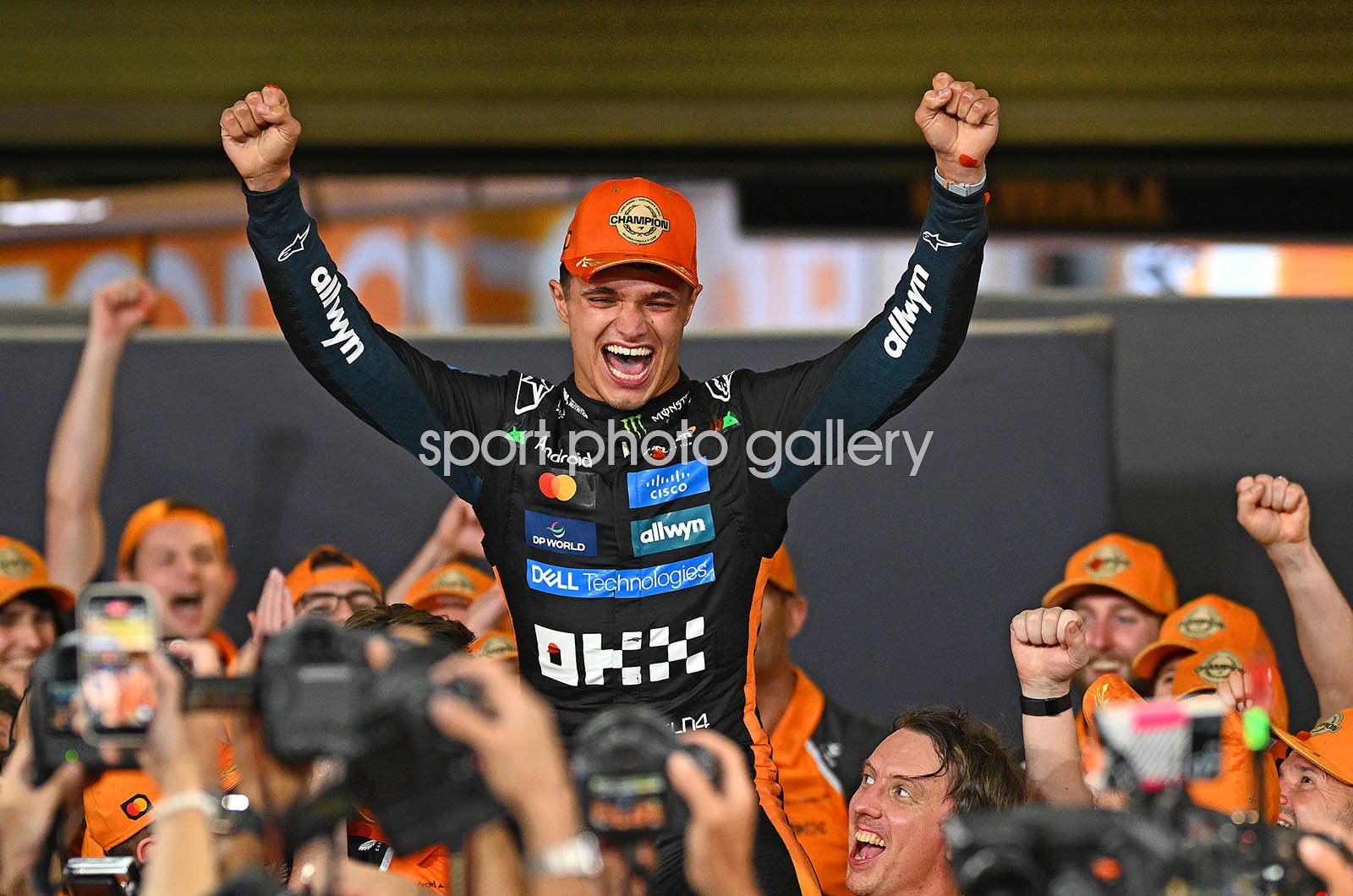 F1 World Drivers Champion Lando Norris of Great Britain and McLaren celebrates with his team during the F1 Grand Prix of Abu Dhabi at Yas Marina Circuit on December 07, 2025 in Abu Dhabi, United Arab Emirates. (Photo by Clive Mason/Getty Images) Code: 2250554857