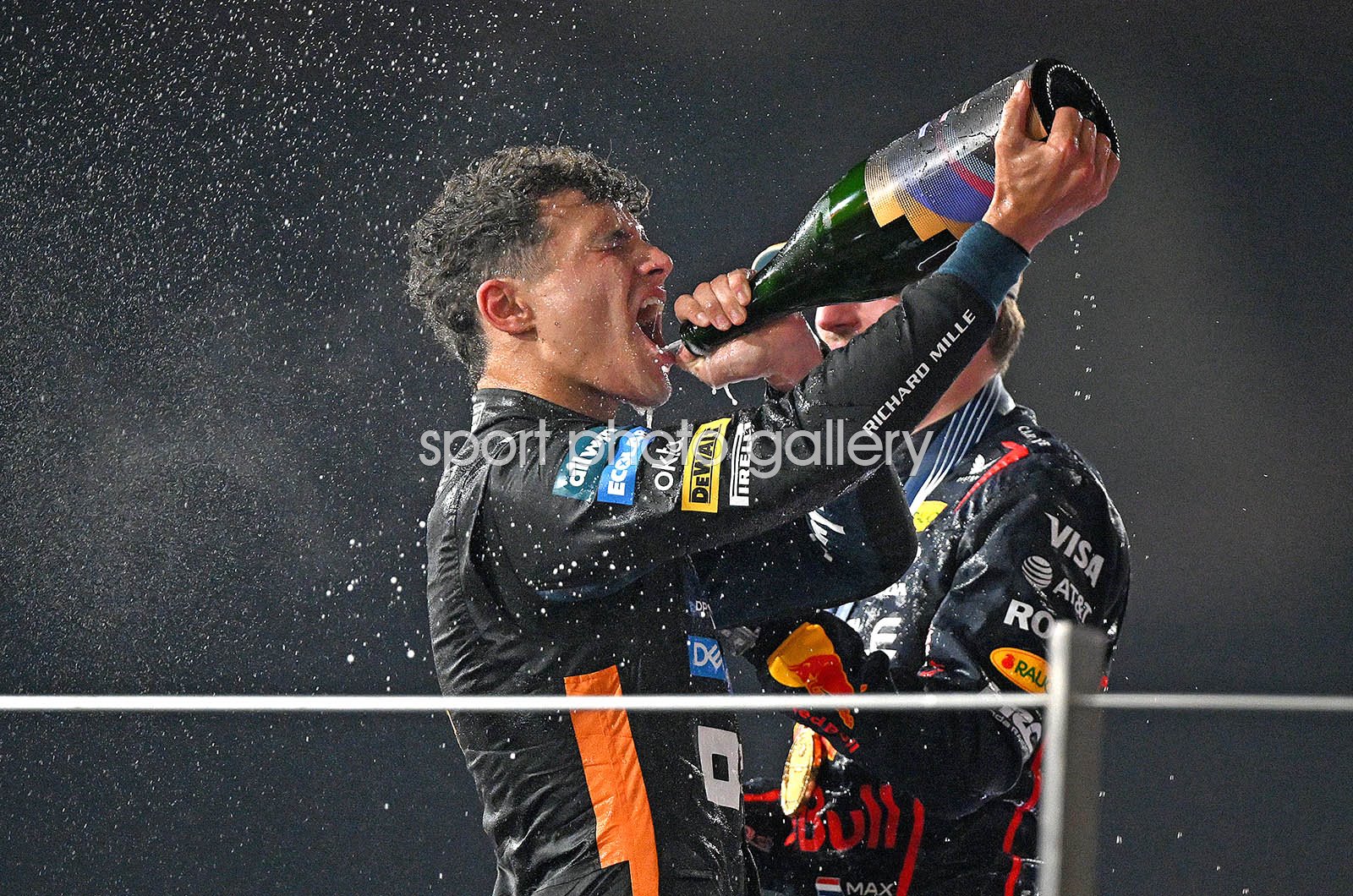 F1 World Drivers Champion and Third placed Lando Norris of Great Britain and McLaren celebrates on the podium with Champagne during the F1 Grand Prix of Abu Dhabi at Yas Marina Circuit on December 07, 2025 in Abu Dhabi, United Arab Emirates. (Photo by Clive Mason/Getty Images)