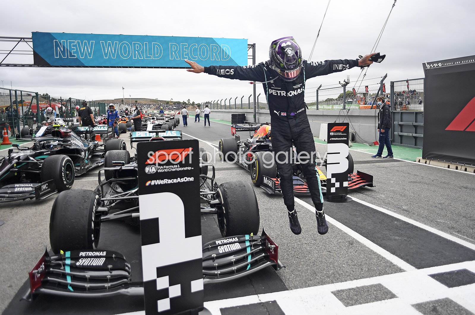 Race winner Lewis Hamilton of Great Britain and Mercedes GP celebrates his record breaking 92nd race win in parc ferme during the F1 Grand Prix of Portugal at Autodromo Internacional do Algarve on October 25, 2020 in Portimao, Portugal. (Photo by Jorge Guerrero - Pool/Getty Images)