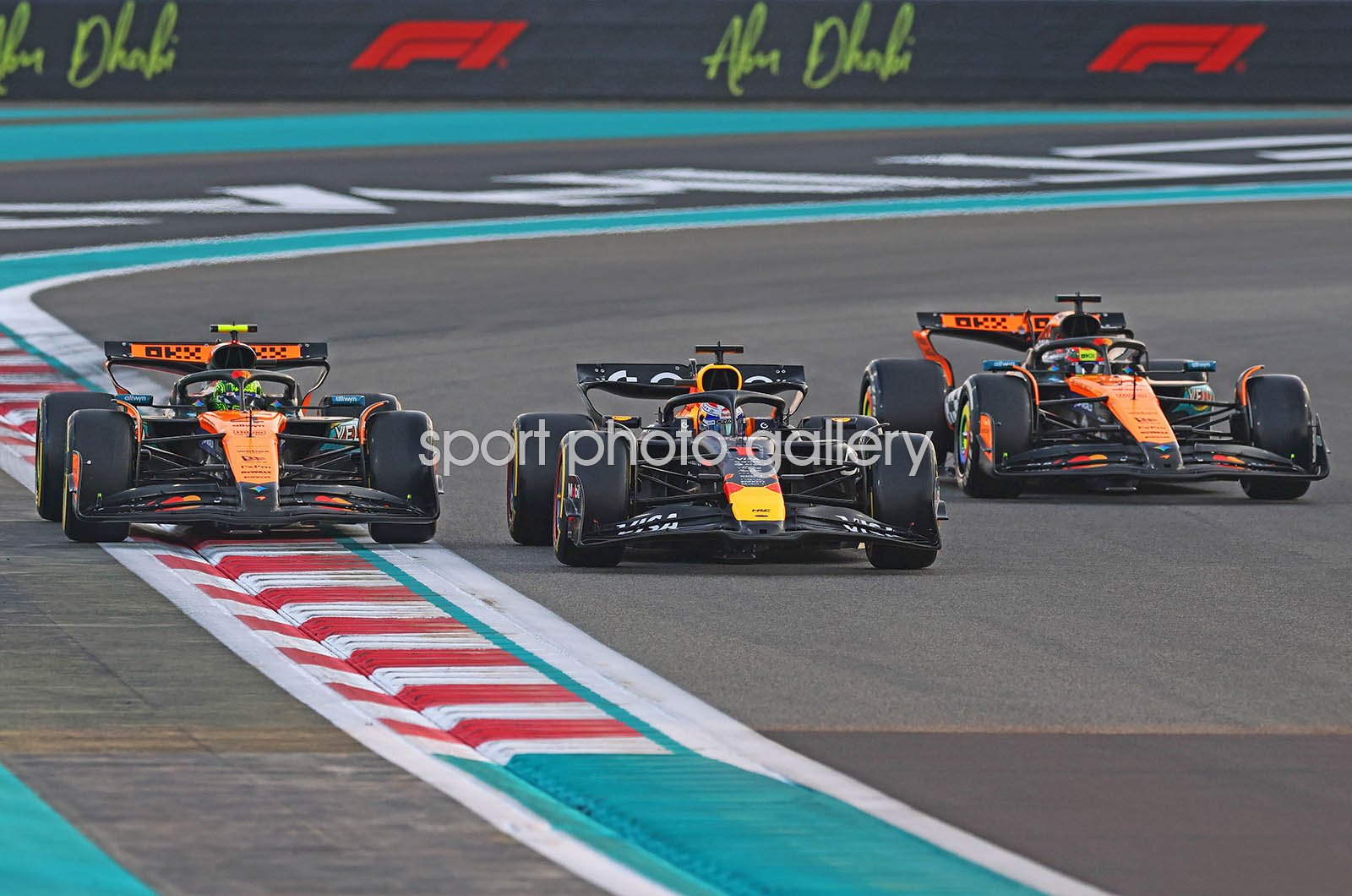 Max Verstappen of the Netherlands driving the (1) Oracle Red Bull Racing RB21 Lando Norris of Great Britain driving the (4) McLaren MCL39 Mercedes and Oscar Piastri of Australia driving the (81) McLaren MCL39 Mercedes on the formation lap during the F1 Grand Prix of Abu Dhabi at Yas Marina Circuit on December 07, 2025 in Abu Dhabi, United Arab Emirates. (Photo by Clive Rose/Getty Images)