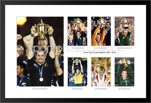 The Rugby World Cup Winners montage features an image of each of the 7 winning captains in the history of the Rugby World Cup lifting the Webb Ellis Cup - David Kirk (New Zealand - 1987), Nick Farr-Jones (Australia 1991), Francois Pienaar (South Africa - 1995), John Eales (Australia - 1999), Martin Johnson (England - 2003), John Smit (South Africa - 2007) and Richie McCaw (New Zealand - 2011 & 2015)
