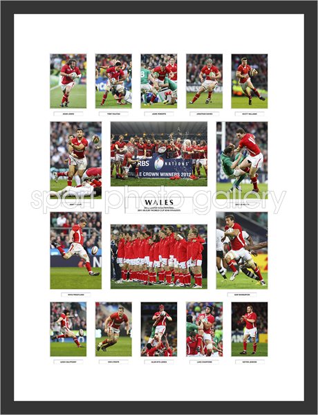 2012 Wales Grand Slam Team Special - a montage to celebrate Wales' 2012 Grand Slam win and their memorable and highly successful World Cup journey. With individual images of 14 of the key players of the Welsh squad together with a team line up taken before the opening game against South Africa and a celebration image after winning the triple crown against England en route to the Grand Slam. The print only 28x20" option comes as a single print with all the player names and central caption in place.