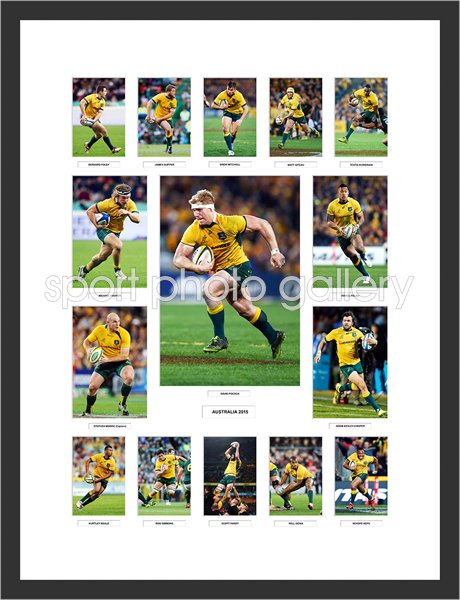 A stunning photo collage of the Australian Rugby Team - the images are from the Rugby Championship and include arguably the world's best player David Pocock as the central image and superstar players Israel Folau, Michael Hooper and Matt Giteau to name a few.