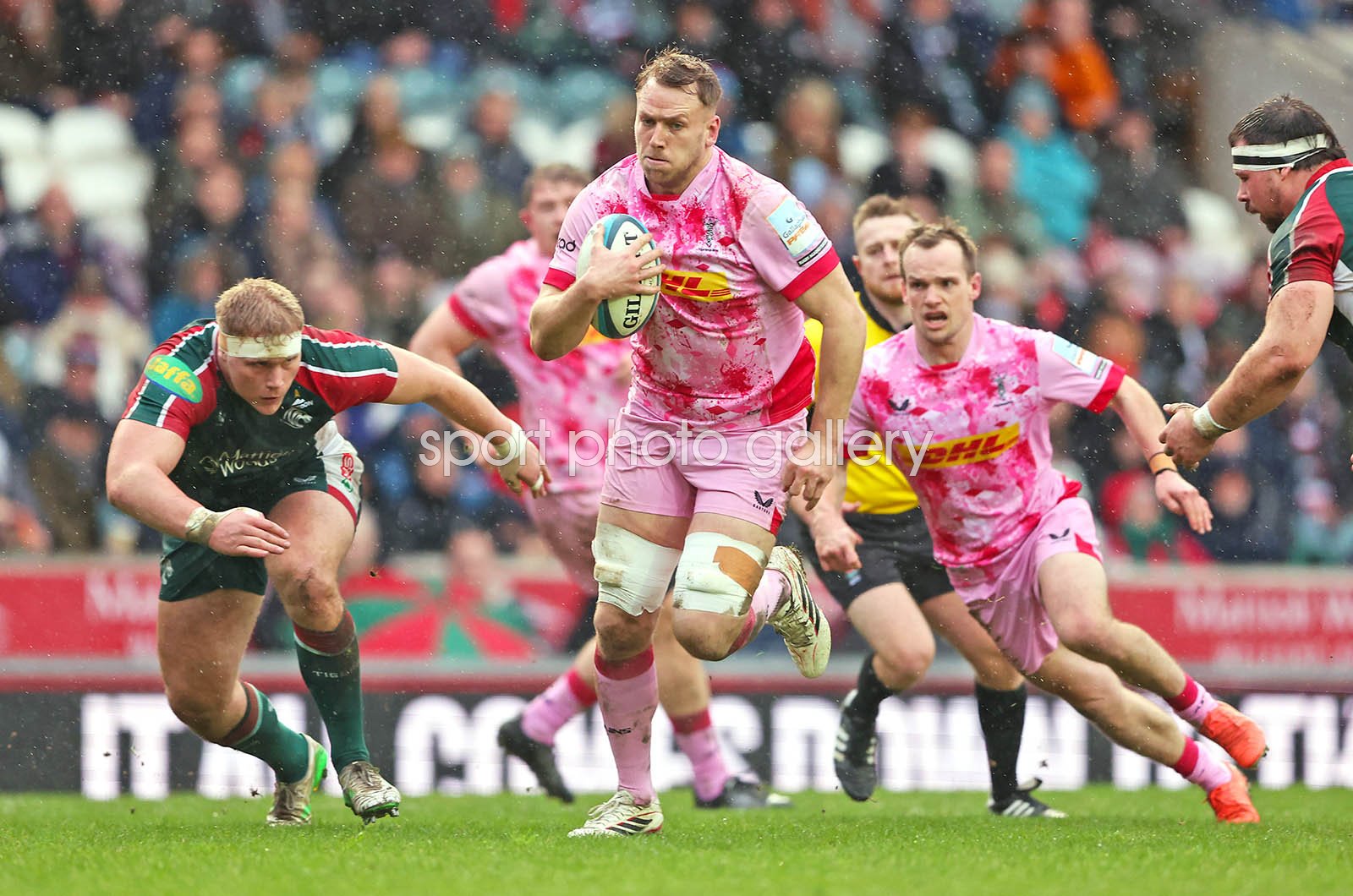 Alex Dombrandt of Harlequins runs with the ball during the PREM Rugby Cup match between Leicester Tigers and Harlequins at Mattioli Woods Welford Road Stadium on February 21, 2026 in Leicester, England. (Photo by Cameron Smith/Getty Images) Code: 2262820901