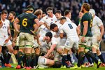 Ben Morgan of England celebrates with team mates after scoring his team's second try of the game during the QBE Intenational match between England and South Africa at Twickenham Stadium on November 15, 2014 in London, England. (Photo by Mike Hewitt/Getty Images)
