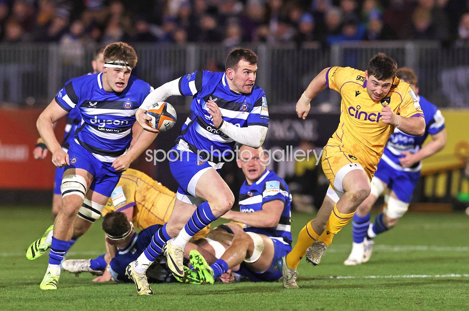 Ben Spencer of Bath breaks with the ball during the Gallagher PREM match between Bath Rugby and Northampton Saints at The Recreation Ground on December 27, 2025 in Bath, England. (Photo by David Rogers/Getty Images) Code: 2253781012