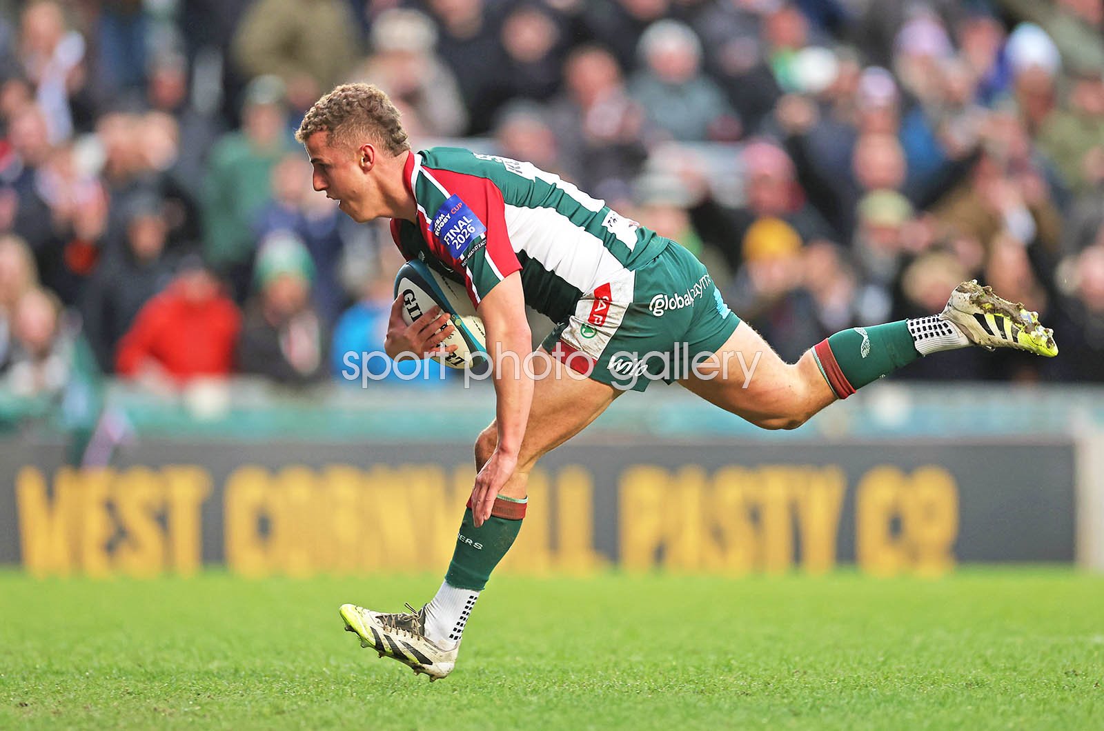 Billy Searle of Leicester Tigers cuts through the defence to score his second tr during the PREM Rugby Cup match between Leicester Tigers and Exeter Chiefs at Mattioli Woods Welford Road Stadium on March 15, 2026 in Leicester, England. (Photo by Jan Kruger/Getty Images)