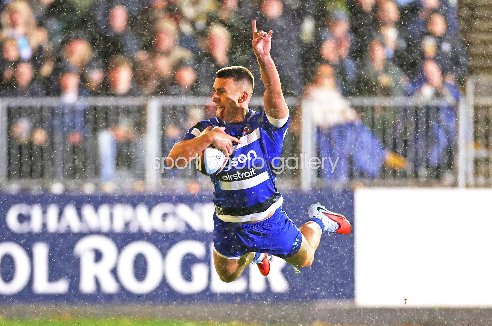 Cameron Redpath of Bath Rugby celebrates scoring his team's second try during the Gallagher PREM match between Bath Rugby and Sale Sharks at The Recreation Ground on October 03, 2025 in Bath, England. (Photo by Michael Steele/Getty Images) Code: 2239032414