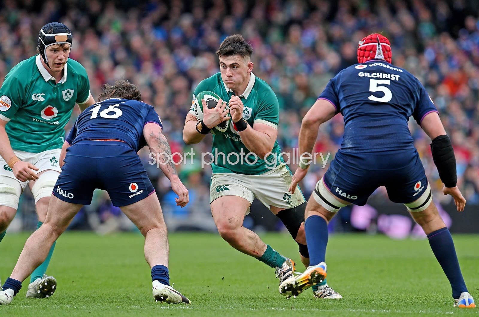 Dan Sheehan of Ireland runs with the ball whilst under pressure from Ewan Ashman of Scotland and Grant Gilchrist of Scotland during the Guinness Six Nations 2026 match between Ireland and Scotland at Aviva Stadium on March 14, 2026 in Dublin, Ireland. (Photo by Charles McQuillan/Getty Images)