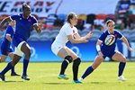 Emily Scarratt of England passes the ball during the Women's Six Nations match between England and France at The Stoop on April 24, 2021 in London, England. Sporting stadiums around the UK remain under strict restrictions due to the Coronavirus Pandemic as Government social distancing laws prohibit fans inside venues resulting in games being played behind closed doors. (Photo by David Rogers/Getty Images)