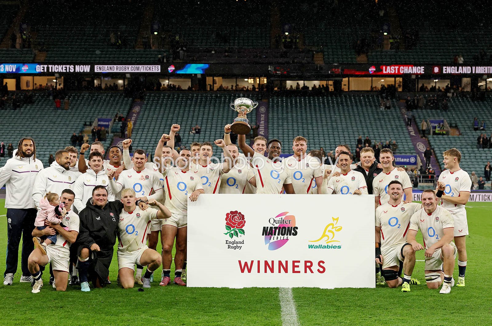 Maro Itoje of England lifts the Ella–Mobbs Trophy as the team poses for a photo following their victory during the Quilter Nations Series 2025 match between England and Australia at Allianz Stadium on November 01, 2025 in London, England. (Photo by David Rogers/Getty Images)