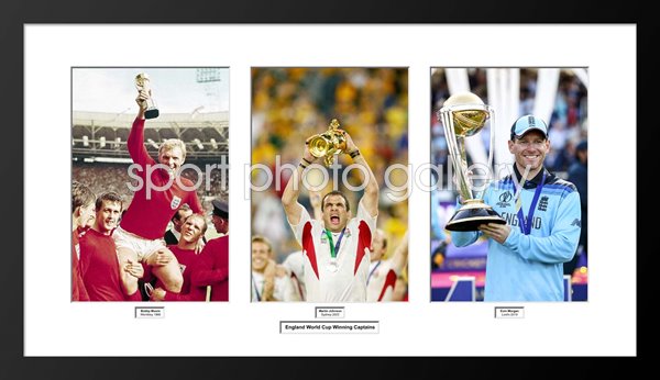 The collage celebrates the captains of the 3 winning teams - Bobby Moore (1966), Martin Johnson (2003) & Eoin Morgan (2019).